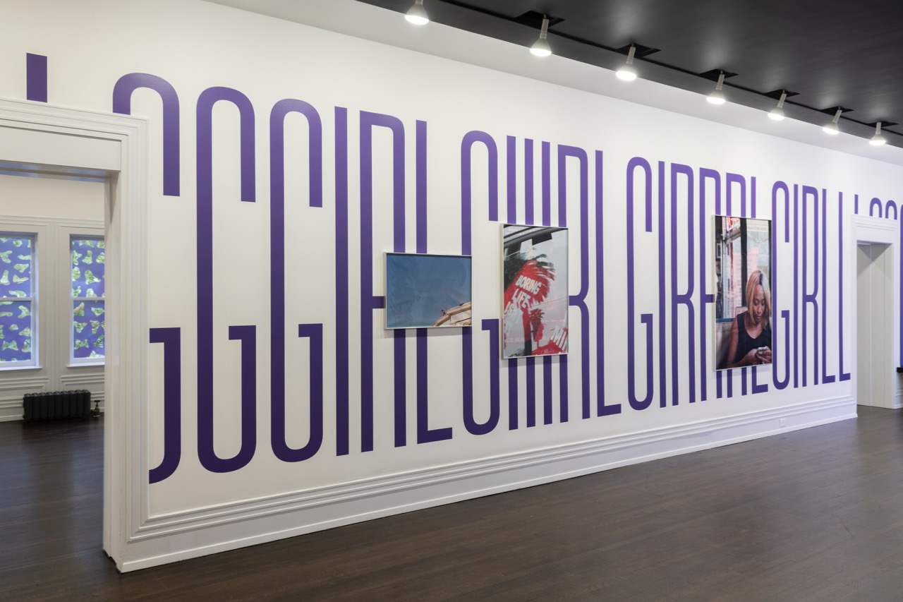 Upstairs, more purple: the walls are white but covered in seven-and-a-half-foot-tall purple letters spelling variations on “girl,” as in “Hey, girl!” and Riot Grrrl and a few others in between. Across those words hang a dozen framed posters for films targeted to African Americans, with titles like Boyz n the Hood and Truck Turner overprinted to varying degrees of opacity with Syms’s own photographs. When viewed through wyd rn?, a phone app created with her studiomate Brent David Freaney (who also acts as WB in the film), the compositions populate with various sorts of data. Syms’s glamorously blurry image of a woman holding a mic comes alive when a soulful acapella tune sings out. Scrolling text conversations (including the eponymous acronym, which stands for “what you doing right now?”) seem as if undertaken live by the woman pictured in a diner, engrossed by her phone. A series of overlapping GIFs of Tyra Banks and other black women celebrities perform gestures of power, ideals to be practiced in the mirror of Syms’s photo of a messy bedroom. These are not 2-D works so much as miniature films. They’re not miniature films so much as select encapsulations of the way life is lived and seen today: a screen view filled with potentially endless cultural references, family memories, abbreviated conversations, audio tracks, and behavioral memes.
