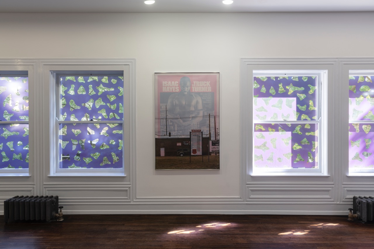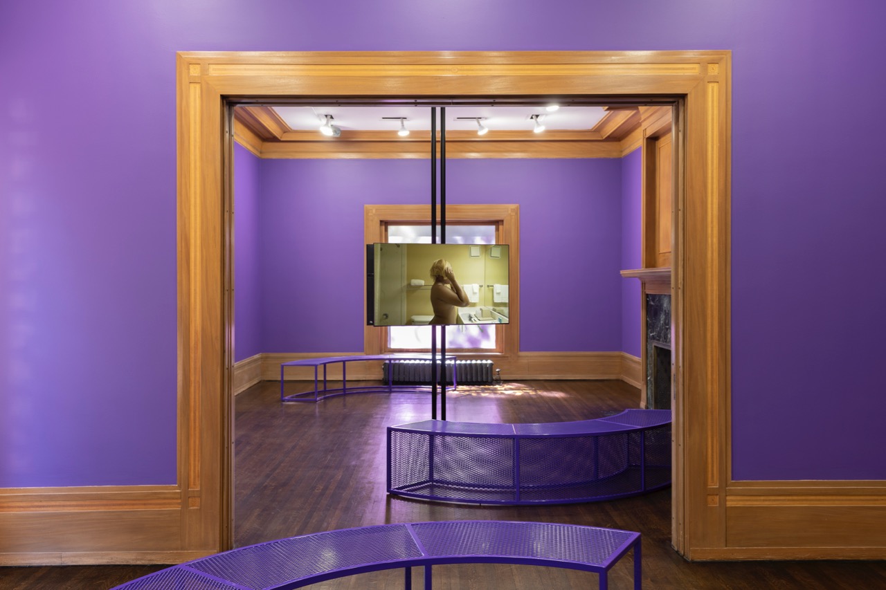 Incense Sweaters & Ice is also a cinematic installation that expands beyond one screen, one surface, one room. The film is split up scene-by-scene, each segment shown sequentially on one of three monitors that cannot be viewed from a single vantage point. Watching the movie thus requires the viewer’s near-constant movement, a situation that annoys not unlike the multitasking of contemporary life. It echoes Girl’s geographical journey, itself a reversal of the Great Migration, when African Americans of the rural southern states moved to the cities of the north and west. But mostly the piece expands by way of the color purple—yes, as in Alice Walker’s 1982 novel about the life of African American women in the south in the 1930s, where purple is independence and pleasure, but bruises too. At the Graham, purple replaces the black screen in between the film’s scenes, paints the downstairs gallery walls and benches, tints the patterned window filters, and does up Queen’s entire set and ensemble. If you don’t get this color, perhaps try harder.