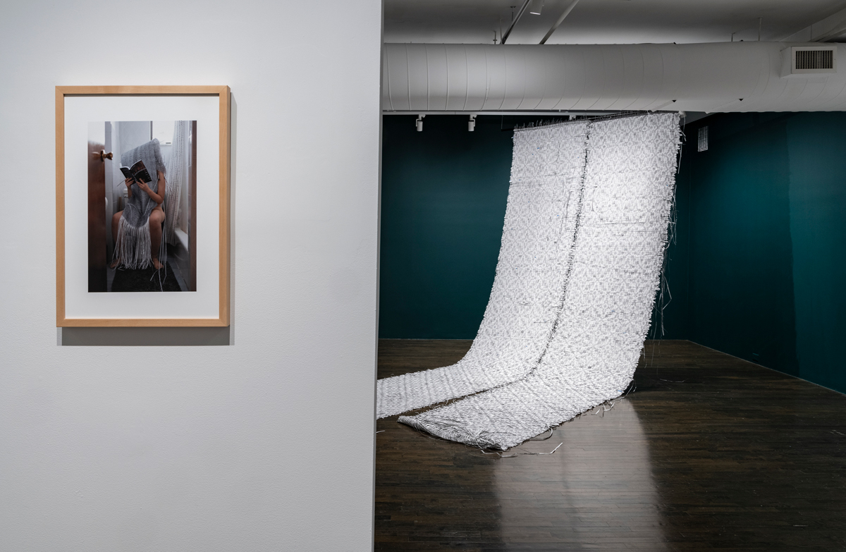 My attention was next commanded by four tapestries woven from long strips of paper printed with writing in bureaucratic serif typefaces. They’re intricate, meticulous crafts, hung from rods and strings, with bumpy edges and loose dangling ends. One is draped majestically from floor to ceiling. When you step close, you can make out partially obscured phrases like: “SECTION 46.206 OF TITLE 45”; “PROSECUTED”; and “PROHIBIT CERTAIN ABORTION.” Unlike with the Weinstein piece, you know, without knowing the source material, that this is politicized and gruesome stuff. On my second lap, I learned that all four are titled a variant of Warp and Weft, and captions expand on the citations. For Warp and Weft #01 (2021), warp is “The Office of Refuge Resettlement’s spreadsheet tracking migrant minors’ pregnancies from 2017–2019,” and weft is “Section 209 of the Department of Labor and Health, Education, and Welfare Appropriation Act of 1977 . . . dissenting opinion by Justice B. Kavanaugh.” The contrast of tedium and suffering here immediately called to mind a piece by Emily Barker: Death by 7,865 Paper Cuts (2019), a tower of the artist’s own xeroxed medical bills adding up to hundreds of thousands of dollars in debt. Both Barker and Han show how grave injury, trauma, and assault can be reduced to a series of infuriating clauses, keywords, and procedural codes. Three photographs accompanying the weavings portray Han shrouded in her text-textiles in domestic settings: reading on the toilet or supine in bed. These vulnerable, quietly funny images allow a body to peek out from behind the paperwork.