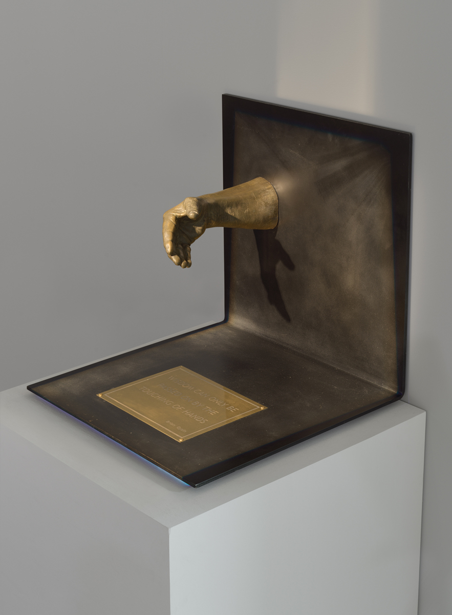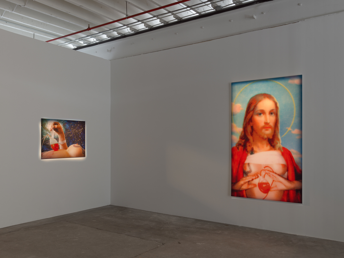 The exhibition, curated by the artists’ longtime gallerist and friend Benjamin Tischer, offers a view into this Gesamtkunstwerk through self-portraits, collages, photos, and videos that chronicle the process and thinking behind it. The show also contains what might be termed relics—bodily matter, a bronze replica of Genesis’s arm—and a shrine containing small artworks, ephemera, and objects Genesis owned. The shrine was built specially for the space by one of Genesis’s daughters (from a previous marriage), Genesse, who loosely modeled it after the Buddhist dome-like stupas she and her father visited while traveling in the Himalayas. There are a few other references to non-Western spirituality, but the iconography—and attendant self-mythology—throughout the exhibition is remarkably biblical. The result is as much hagiography as art show.
