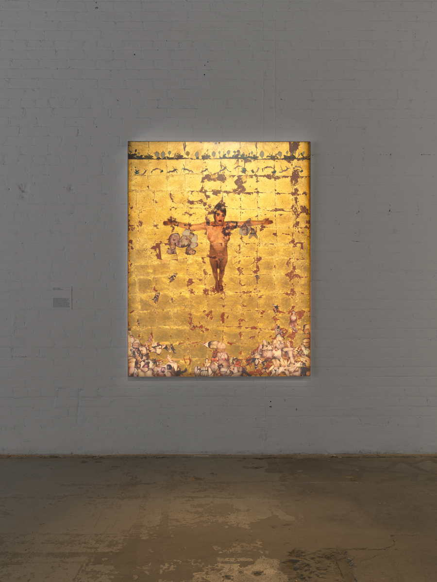 Near the shrine, a large collage, Cruciform (Sigil Working) (2005), shows Genesis with arms spread in a Jesus-T on a gold-leaf background, surrounded by clippings of pictures of pandrogynous body parts. The idea of collage was key to Genesis, who first met William S. Burroughs in 1972 and often cited the author’s well-known cut-up method as a central inspiration for he/r life’s work. To Genesis, the cut-up body of the Pandrogyne was the ultimate extension of the cut-up tactic as previously applied to word, image, and sound.