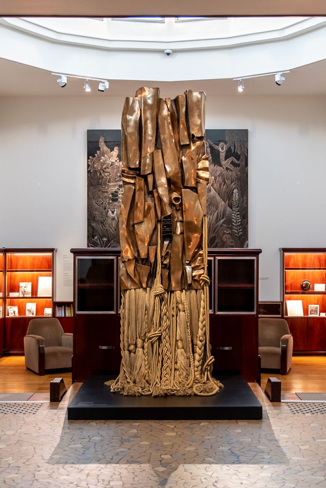 Barbara Chase-Riboud: Quand un nœud est dénoué, un dieu est libéré (Every Time a Knot Is Undone, a God Is Released), installation view. Courtesy Palais de la Porte Dorée. © Anne Volery. Pictured, center: Zanzibar Gold, 1974–75.